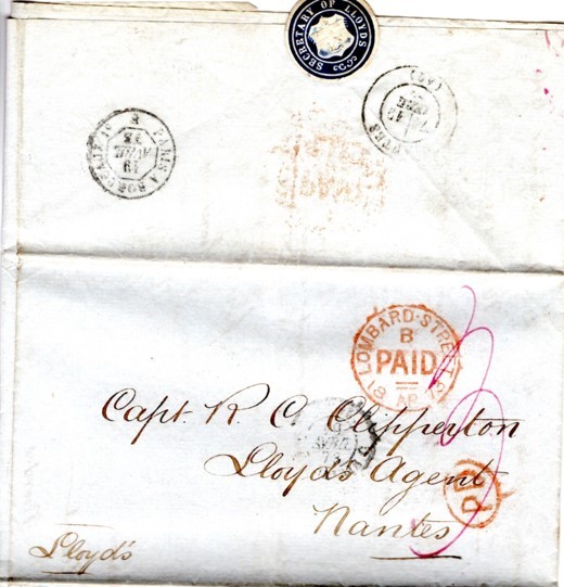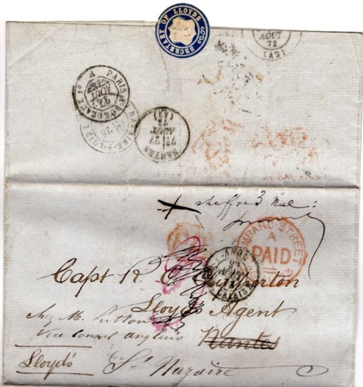 I have two items sent months apart in 1873 from London to Nantes. But the individual had moved on and resulted in a redirected cover that is particularly involved. I have identified the Paris.- Bordeaux Convoyeur but looking at a map, the fact that anything going to Nantes (or on to St. Nazaire) went through both of those cities raises more questions than answers. Let me start the discussion by asking which of the markings present are part of the "normal" routing of mail from London to Nantes during this time? That would separate out those involved with the redirection. Any help you may be able to offer would be most appreciated.