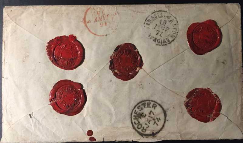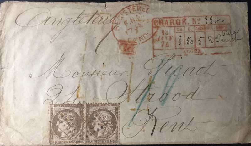 Now we come to the franking of 60c and the red "pd" mark. Mu understanding is that the foreign letter rate in 1874 was 30c to which would have been added the registration fee of 60c making 90c in all. The french post office were always very careful with registered items that had to be prepaid so there is a problem here .