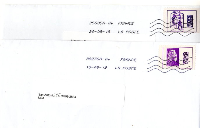 I have found postal forgeries of recent Marianne stamps used to mail Nigeria-type scam letters from France to the United States. See images. I have a few questions:
