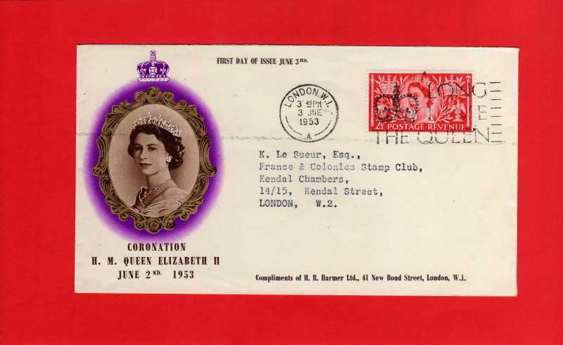 I purchased a box of Guernsey covers this week and tucked inside was a 1953 Coronation GB FDC addressed to K Le Seur, France & Colonies Stamp Club!