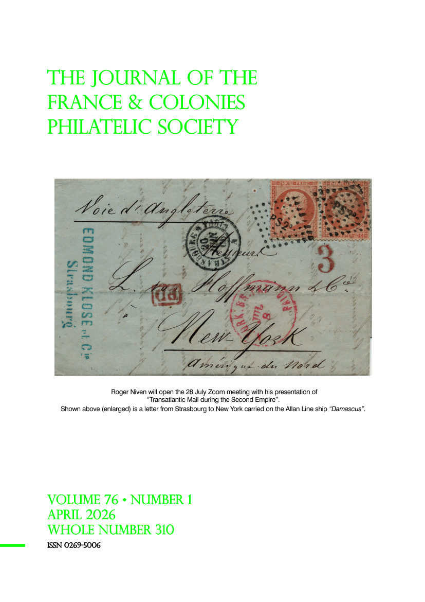 The Journal of the France & Colonies Philatelic Society is published three times per year, in April, August, and December. It contains articles by members and non-members on all aspects of philately, postal history and related topics concerning France and her former Colonies. Society Notes, Lists of Recently Published Articles (in French and other philatelic periodicals), Reports of Meetings, Illustrated Auction Lots, Books Reviewed and Noted, updated French Postal Rates, and the annual Index (in the last issue of the year) are all regular features.